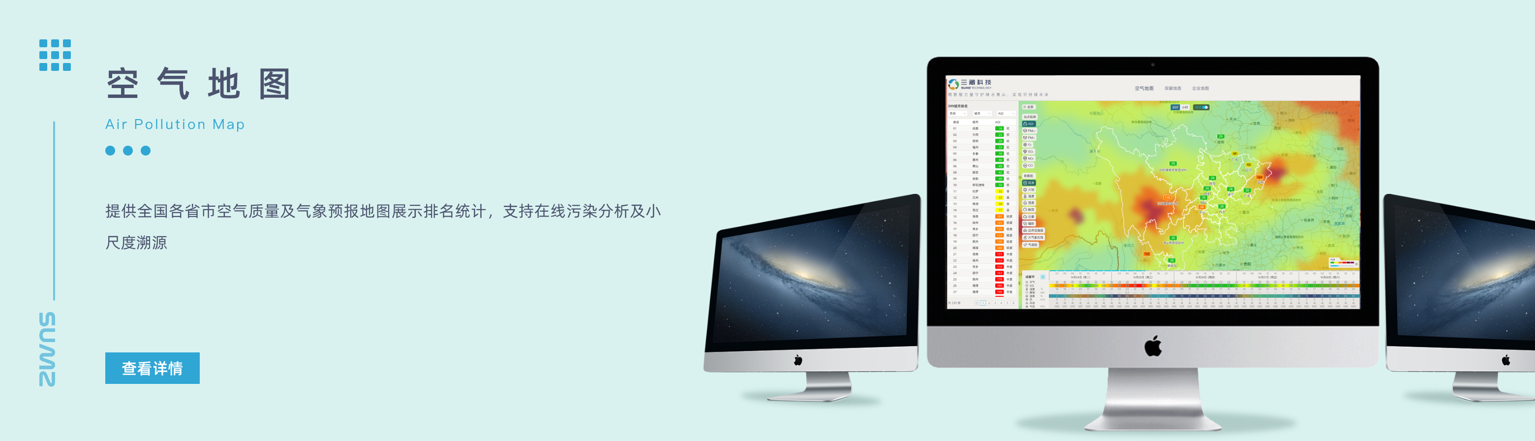 提供全國各省市空氣質量及氣象預報地圖展示排名統計,支持在線污染分析及小尺度溯源